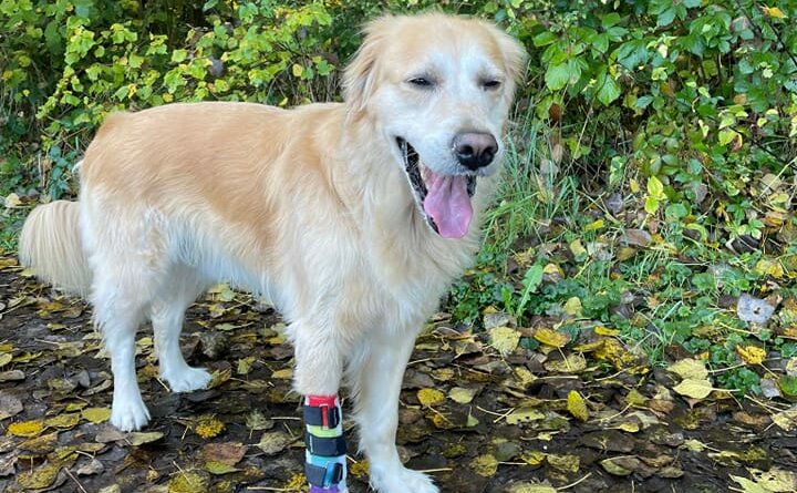 Auf dem Foto seht ihr meinen Patientenhund Sam mit einer Orthese von Orthopets . Sam hat einen irreparablen Bänderriss in der Vorderpfote und läuft mit Physiotherapie und Orthese wieder super.