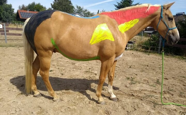Ich habe vor längerer Zeit mal für einen Kurs die Muskeln des Pferdes, die beim Reiten beansprucht werden, auf mein Pony gepinselt.