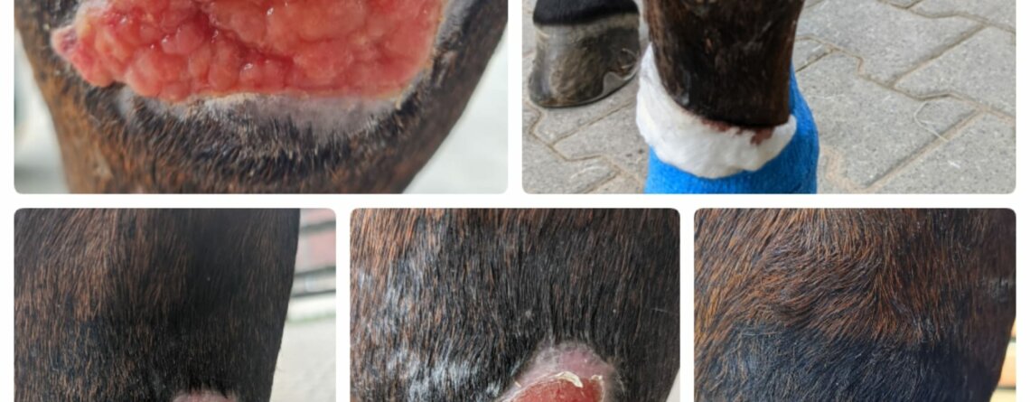 Auf dem Bildern seht ihr den Verlauf einer Wunde am Karpalgelenk mit Bildung von wildem Fleisch innerhalb von drei Wochen, ich finde, das ist super geworden.